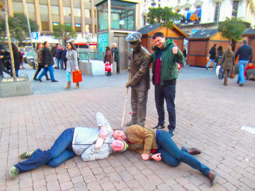After Danny’s aborted narco-hunt, there was further evidence of his judgement being a little skewed when, to our collective amusement, he threw a Euro down at the base of a bronze statue of a streeet-sweeper, thinking it was one of those stupid stand-still street performer sods…